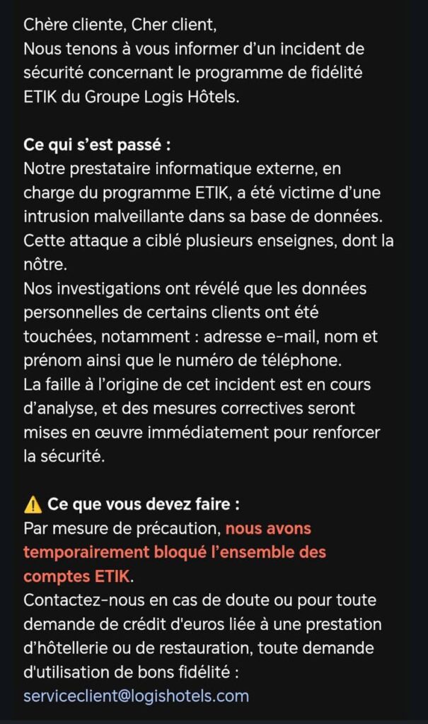 Logis Hotels vient d’avertir ses clients du programme ETIK par email, ce mardi 14 avril, de l’intrusion malveillante dans sa base de données.